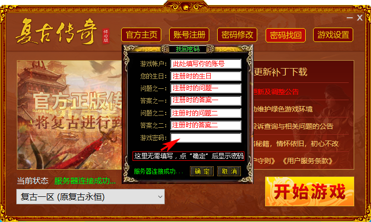 一、打开复古传奇登陆器,选择好您要找回密码的服务器(如下图1)
